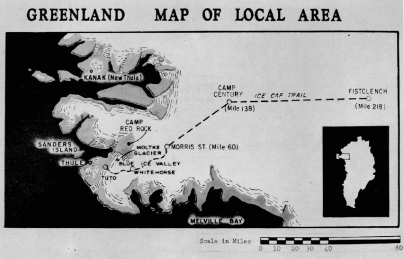 This simple map, likely from a report during the mid-fifties or early 1960s, shows relative distances and locations of the previous Thule Air Base (“TAB”), Camp TUTO, Camp Century, and Camp Fistclench to name a few.